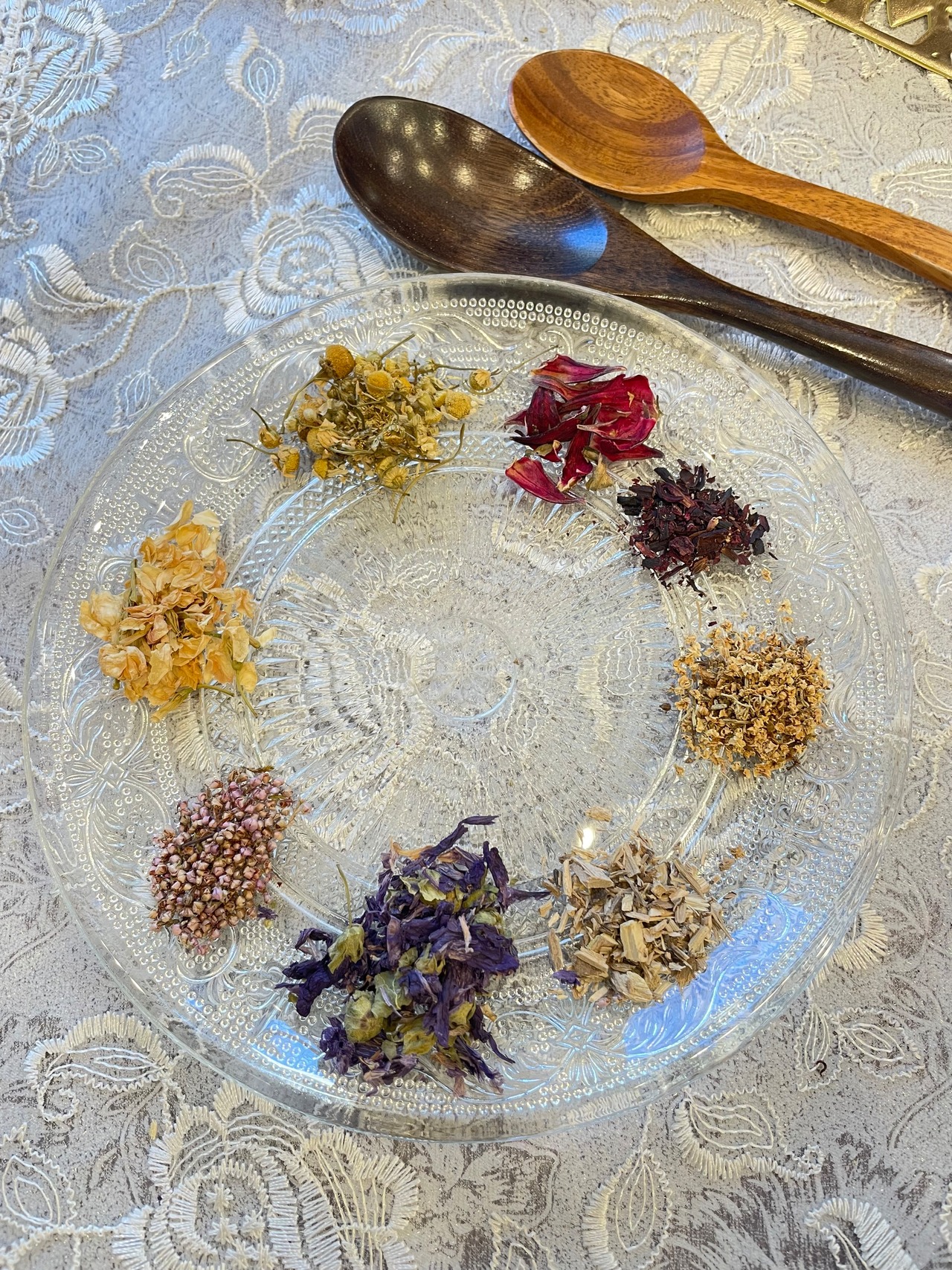 りんごの香りのカモミール、小さなお花のエルダーフラワー、真っ赤なお花のハイビスカス、エゾウコギは心のお花、マロウは青いお花、ジャスミンは香り高い黄色、ピンクの美肌のヒースです。